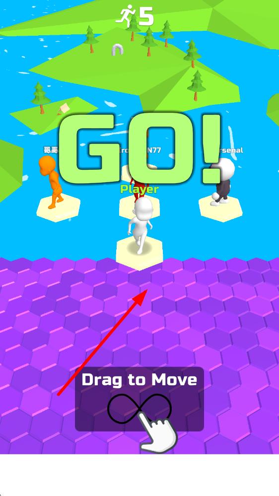 1、进入界面后操控角色在初始平台移动,踩踏过的方块3秒后消失,滑动屏幕躲避掉落陷阱,点击屏幕使用武器攻击对手。