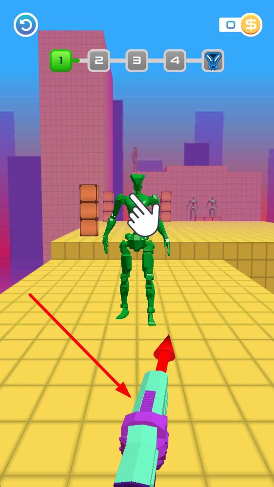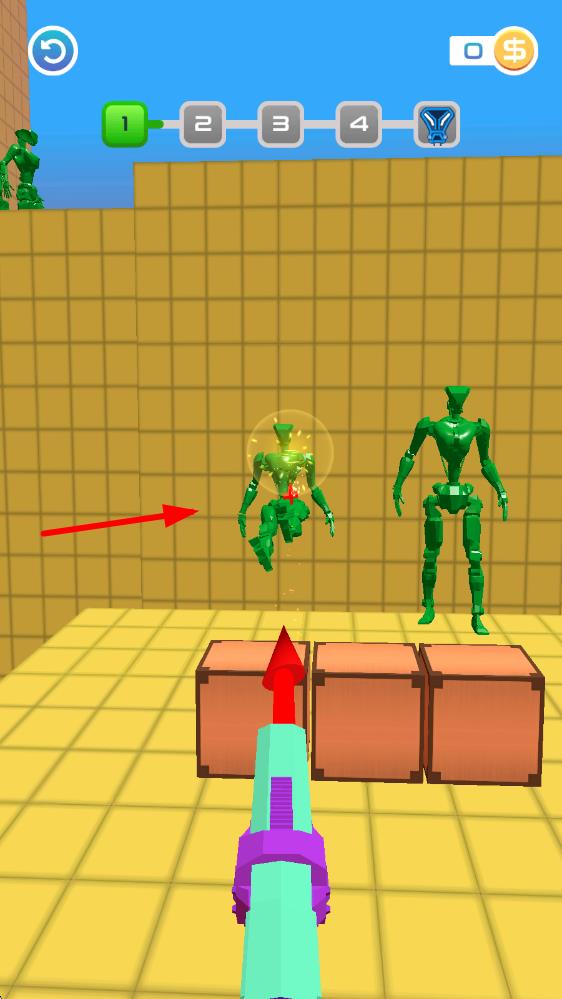 1、进入界面后滑动屏幕调整投掷角度,点击屏幕释放长矛,利用抛物线轨迹刺穿站立的敌人,注意躲避蓝色盾牌防御。