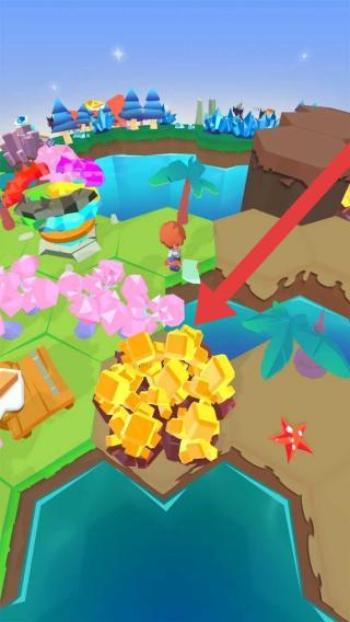1、画面呈现卡通风格的场景,有角色、黄色矿石堆、粉色花朵、水域、树木、建筑等元素,属于该游戏中探索采集类的玩法场景。