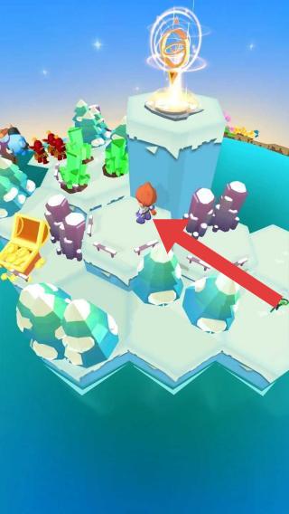 2、画面呈现卡通风格的冰雪场景,有角色、宝箱、彩色晶体、传送装置的发光物体等元素,红色箭头指向角色,属于探索闯关类的玩法场景。
