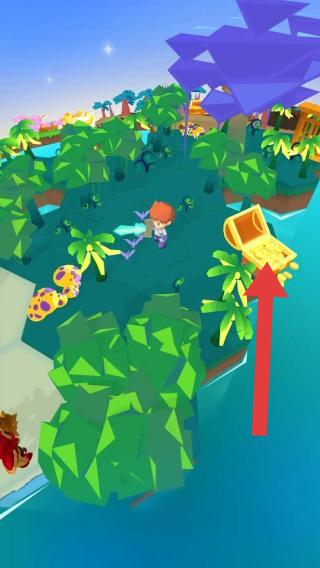 3、画面呈现卡通风格的丛林场景,有角色(手持武器)、宝箱、彩色蘑菇、植物、水域等元素,属于探索寻宝类的玩法场景。