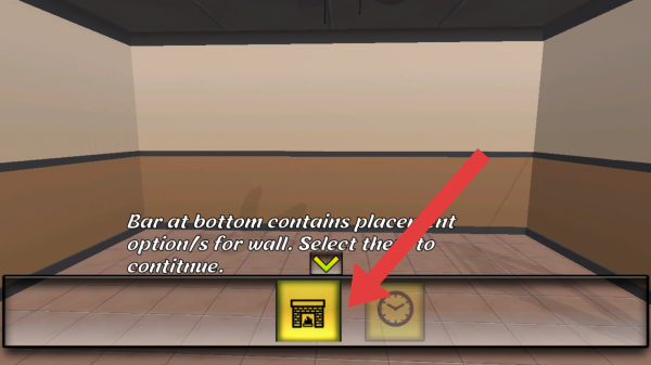 2、画面呈现空旷房间场景,下方有操作提示文字,底部有两个功能图标(一个房屋建筑、一个类似时钟),红色箭头指向房屋建筑图标。