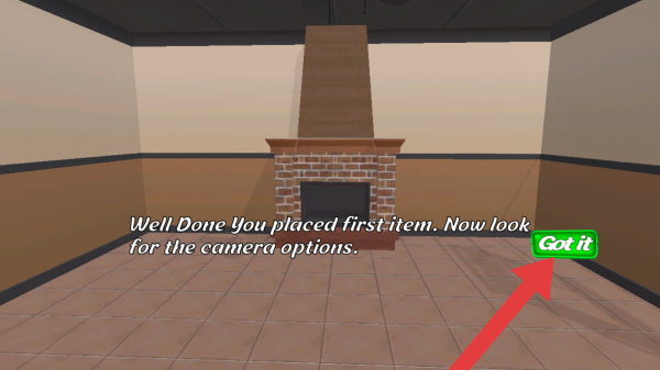 3、画面呈现已放置壁炉(“firstitem”)的房间场景,文字提示,右侧有绿色“Gotit”按钮,用于确认提示信息。