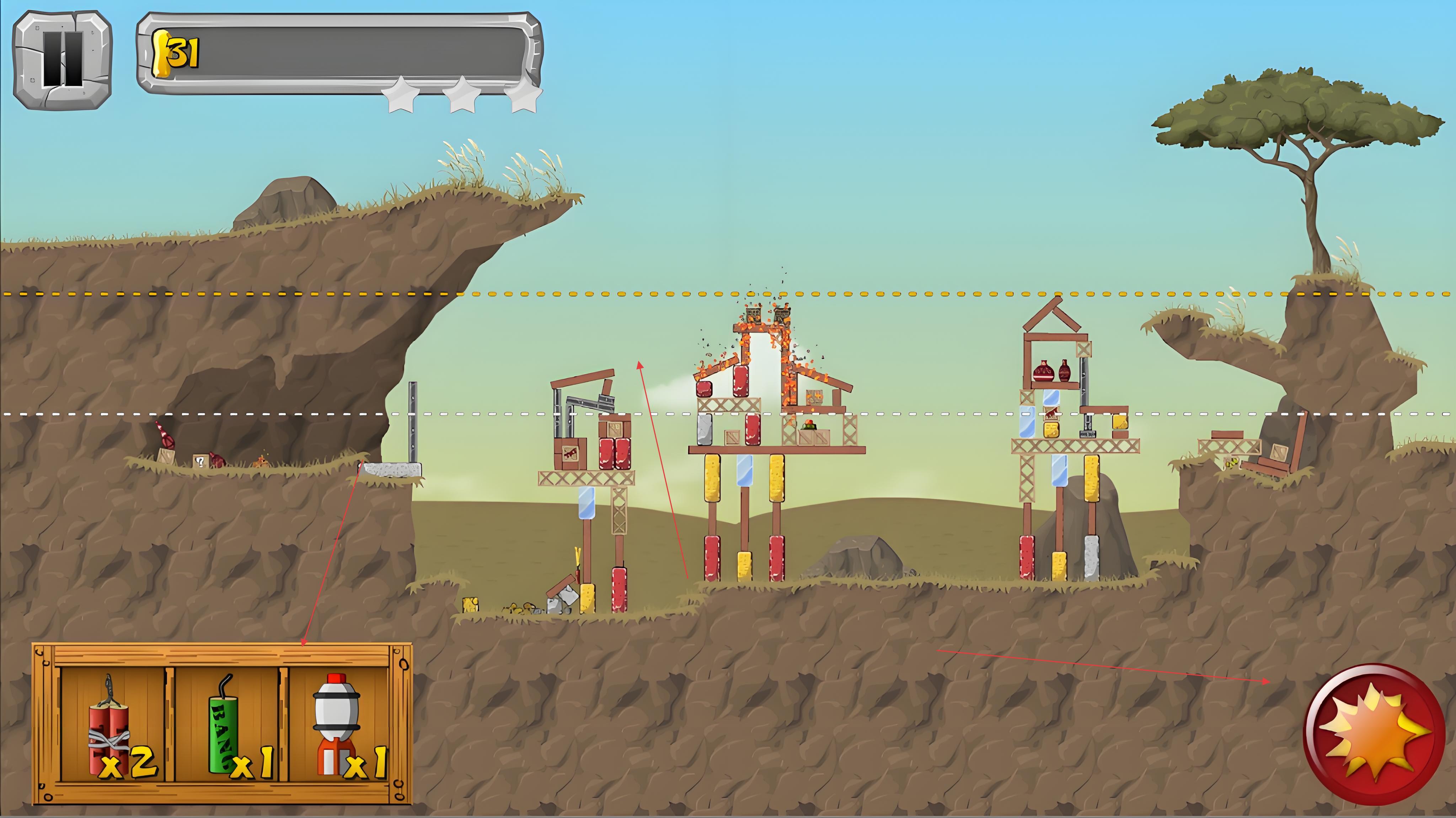 2、爆破策略规划:使用dynamite时按「三角形布点法」放置炸药,底层3处、中层2处、顶层1处,可控制建筑向指定方向平稳倒塌。
