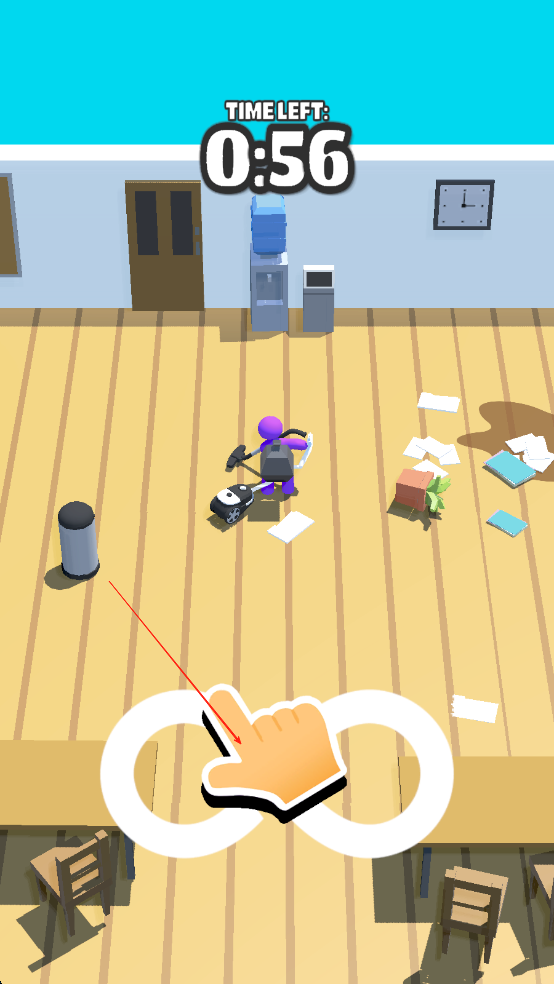 1、进入游戏后点击屏幕选取吸尘器,沿地板纹路滑动清除表面灰尘,遇到黏在地毯的gum需先用刮刀刮除再喷洒去渍剂。