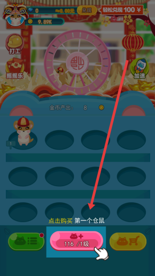 1、通过点击【116/1级】按钮(红箭头指向),花费金币购买第一个仓鼠,增加产出。