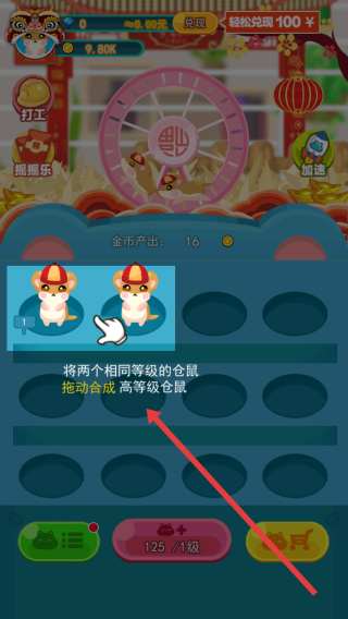 2、将两个相同等级仓鼠拖动合成(红箭头指向),提升仓鼠等级,增加金币产出效率。