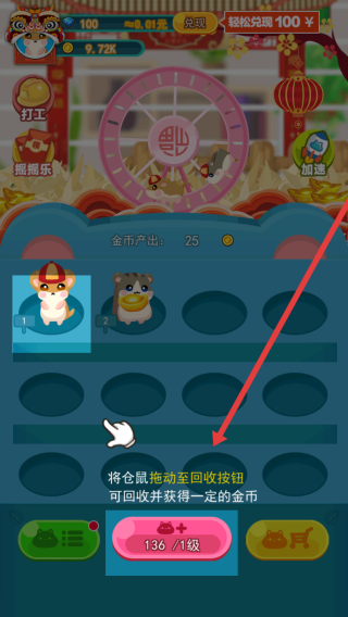 3、把仓鼠拖至回收按钮(红箭头指向),回收获得金币,用于购买或合成新仓鼠。