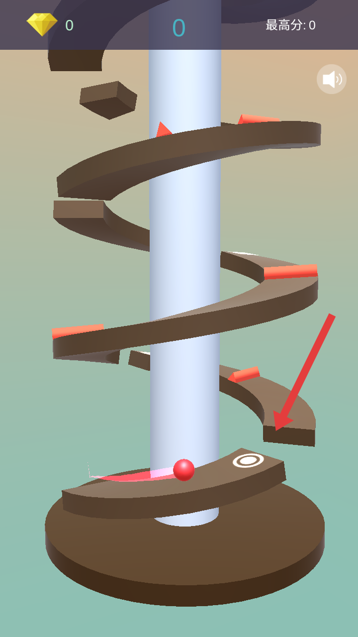 2、在球球跳塔的游戏内,操控红球沿螺旋塔下落,躲避红色尖刺障碍,持续下落以积累分数。
