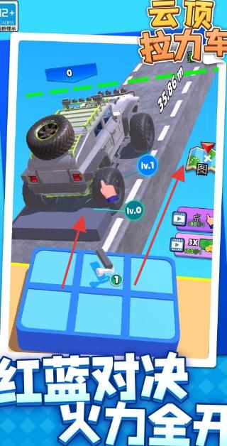 2、选择关卡,操控拉力车在赛道行驶,应对不同地形(山地、公路等),与对手展开红蓝对决。