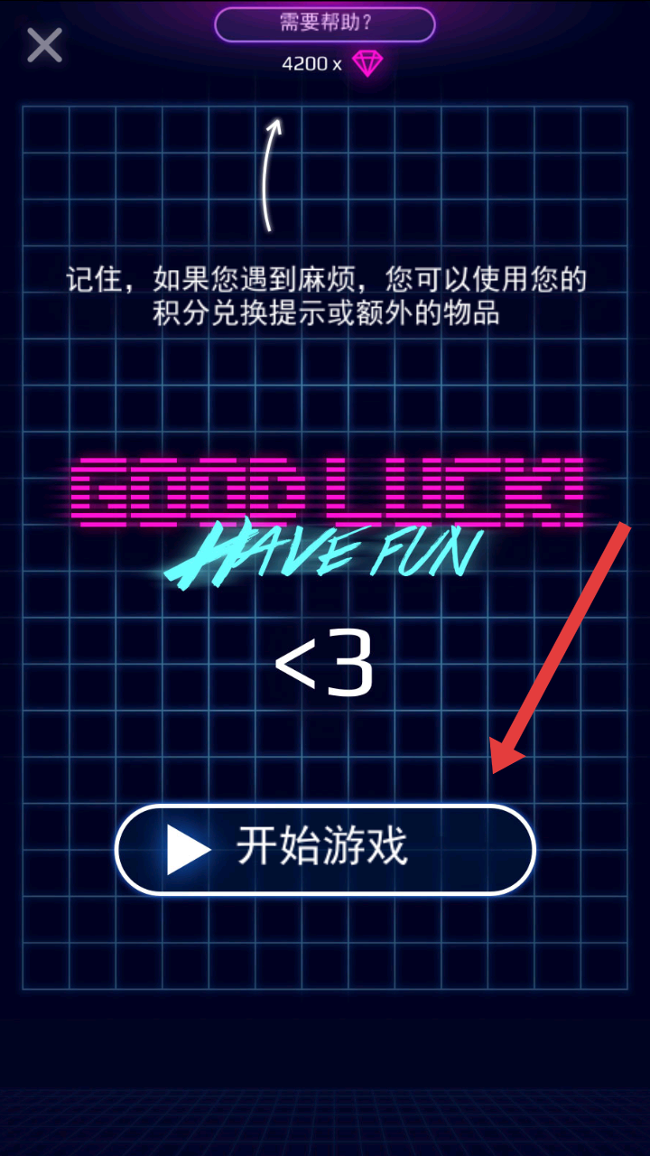 2、在Dreamy Laser的系统提示界面,点击【开始游戏】进入游玩,牢记积分可兑换提示或道具。