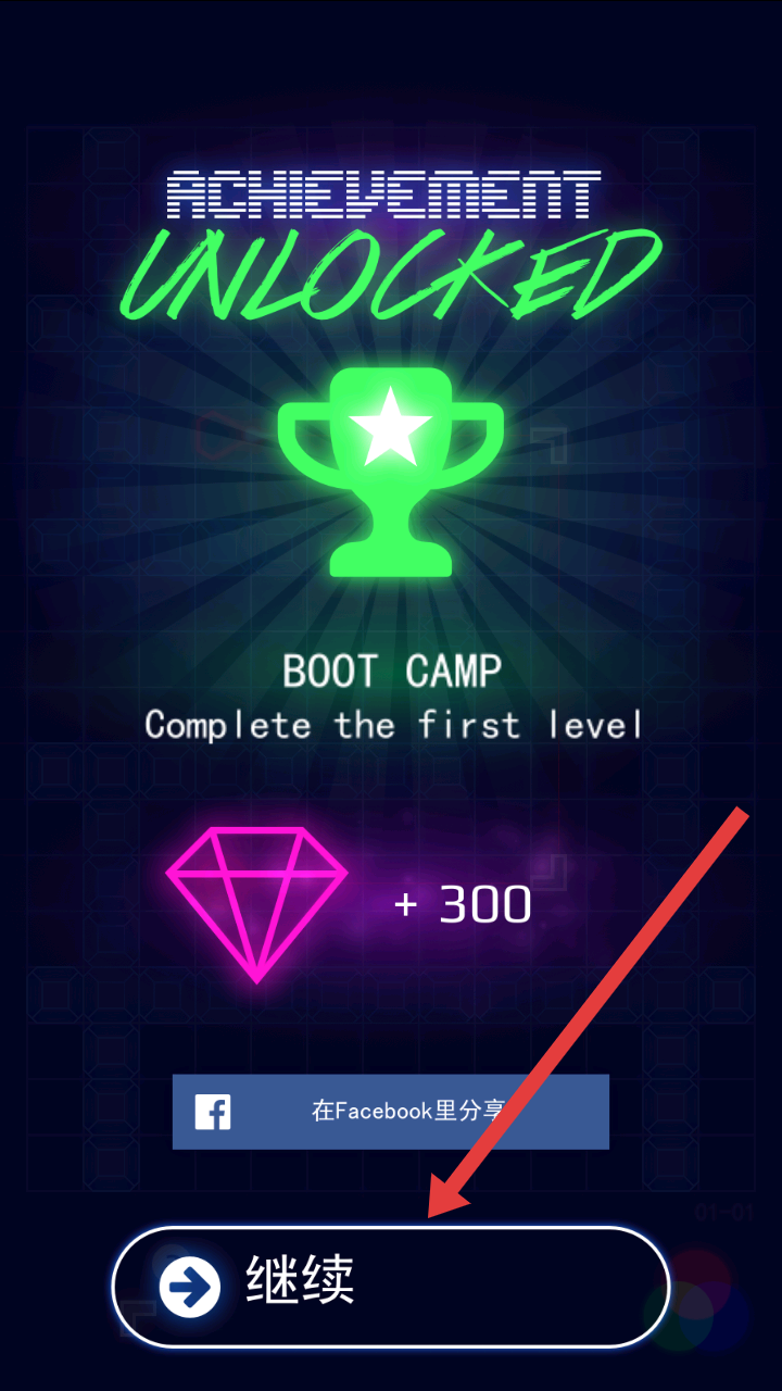 3、解锁【BOOTCAMP】成就(完成首关)后,点击【继续】按钮推进游戏,也可分享至Facebook。