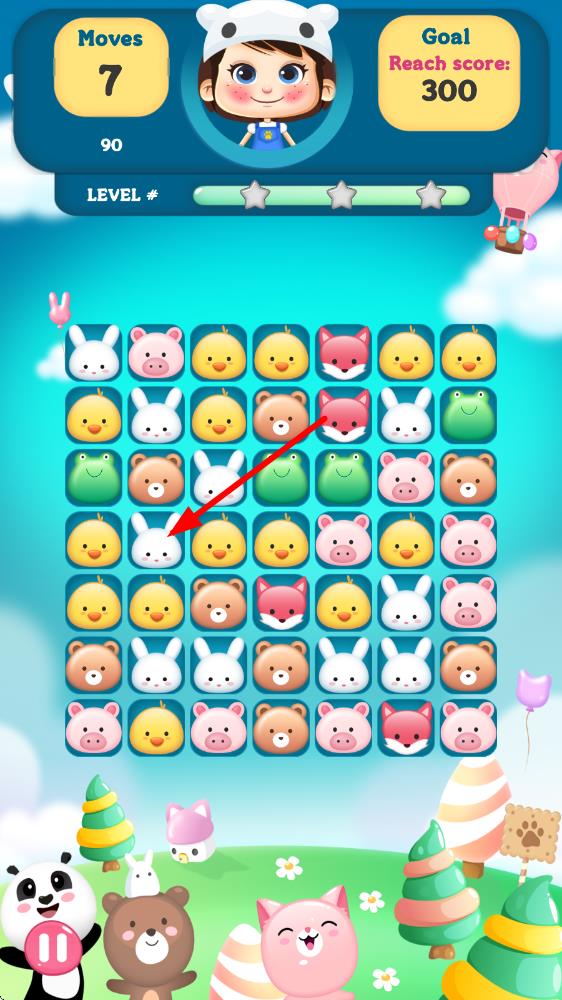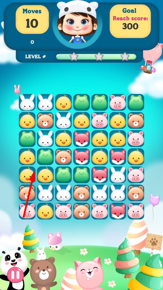 1、进入关卡后滑动屏幕调整动物位置,将三个相同动物连成一线即可消除,优先消除角落动物拓展消除空间。
