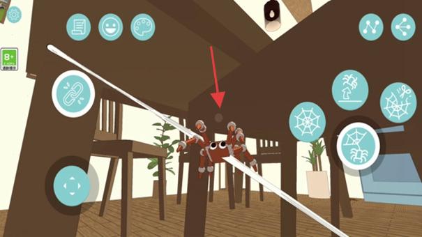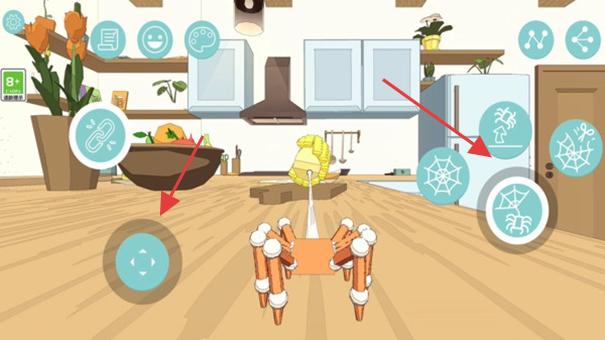1、进入游戏,在场景(如厨房)通过虚拟摇杆操控蜘蛛移动,点击技能图标(蛛网等)与环境互动。
