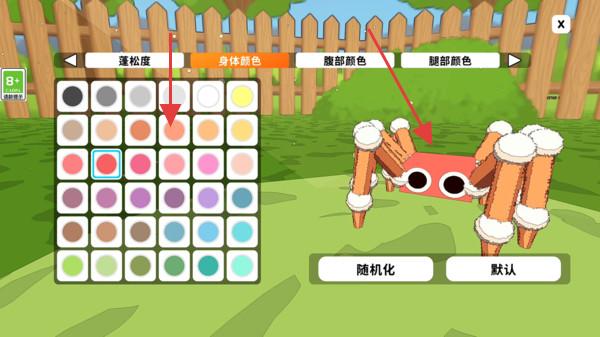 2、打开外观设置,选择身体、腹部、腿部颜色等参数,自定义蜘蛛外观,打造独特宠物形象。