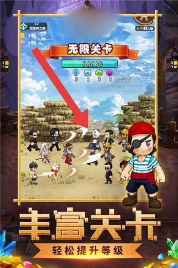 1、进入游戏,选“无限关卡”(红箭头指向),带领角色队伍,挑战无尽关卡,提升等级。