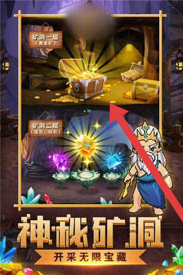 2、探索“神秘矿洞”,进入“矿洞一层”(红箭头指向),开采金币、宝石,获取资源。