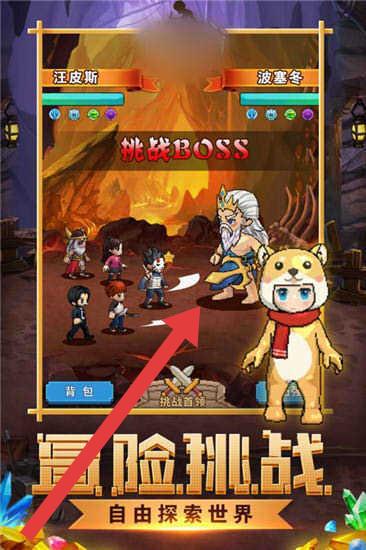 3、参与“冒险挑战”,挑战BOSS(红箭头指向),搭配队伍,释放技能,赢取奖励,探索世界。