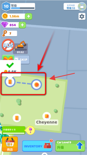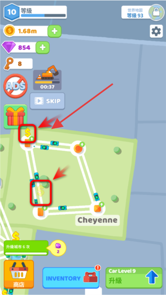 3、关注带“$”标识的建筑,点击收取金币,积累资源用于升级汽车、城市建筑,提升等级。
