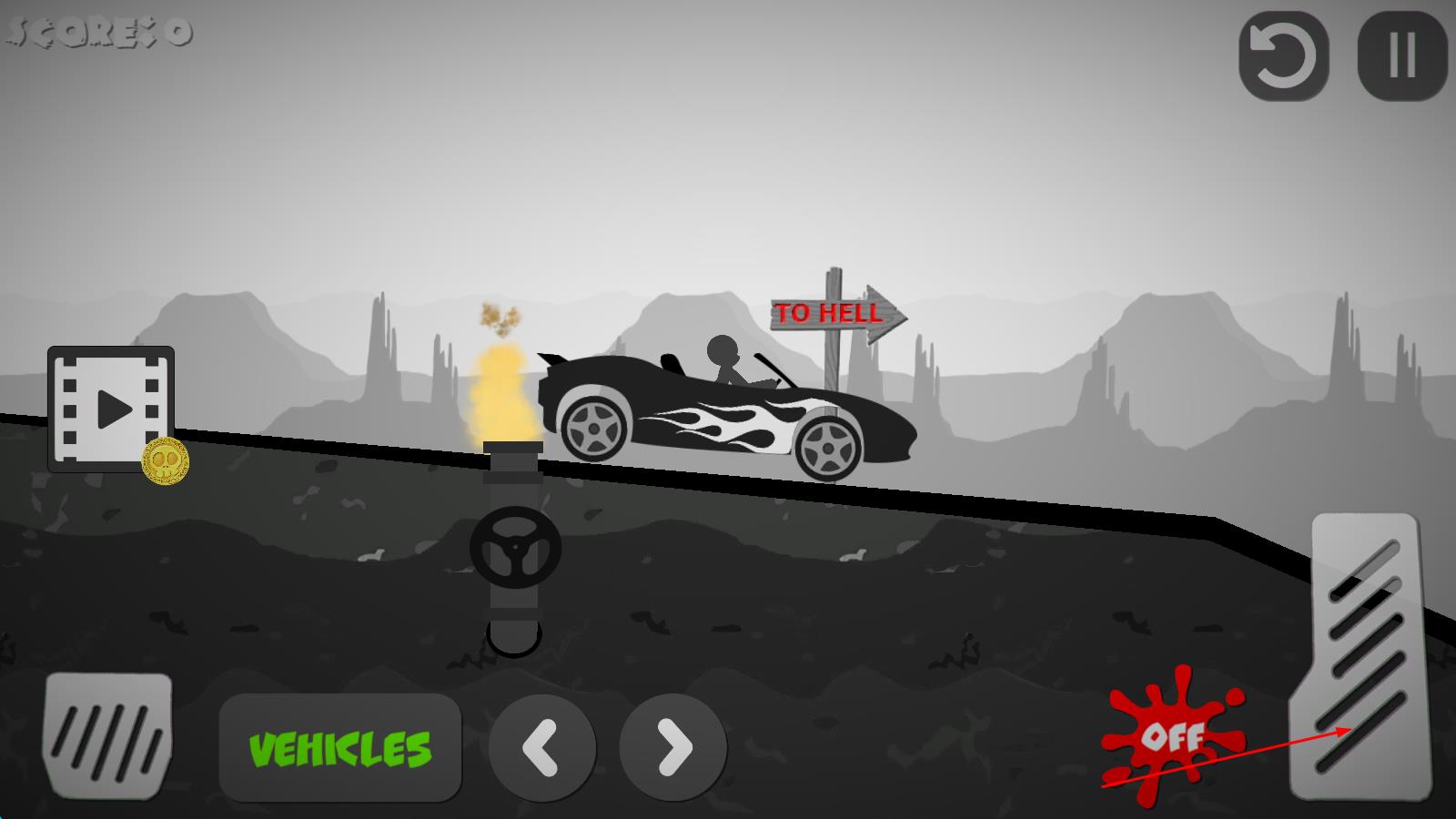 2、游戏进行中,用刹车和油门控制车辆方向与速度,精准撞击火柴人,车辆翻转时点击重置按钮继续游戏。