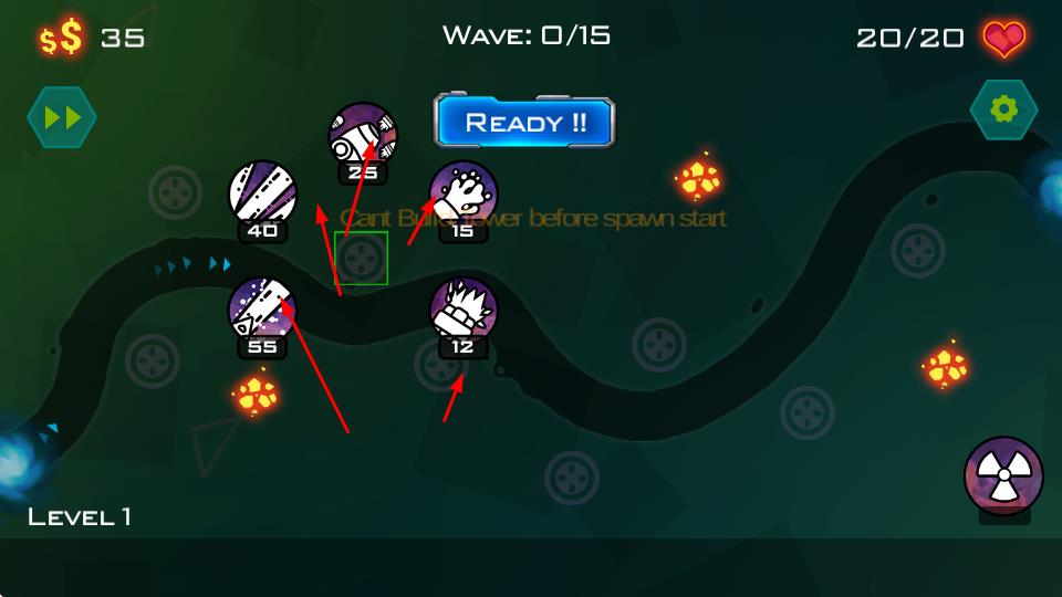 1、进入Level1关卡,Wave:0/15时,消耗$$资源,点击可选防御单位(如数值标识的技能)布置,准备迎敌。
