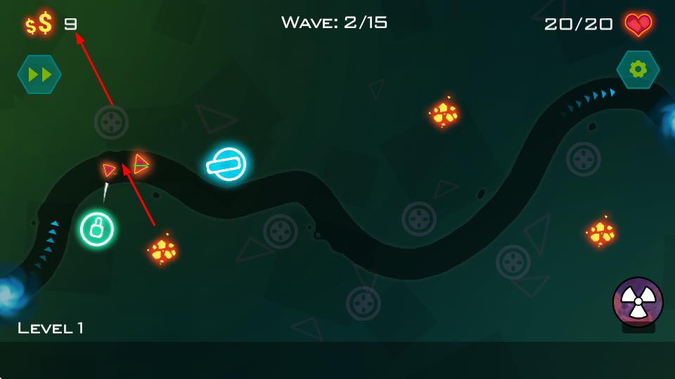 2、Wave:1/15波次开启,已布置防御自动攻击路径上敌人,关注资源变化,适时补充或升级防御。
