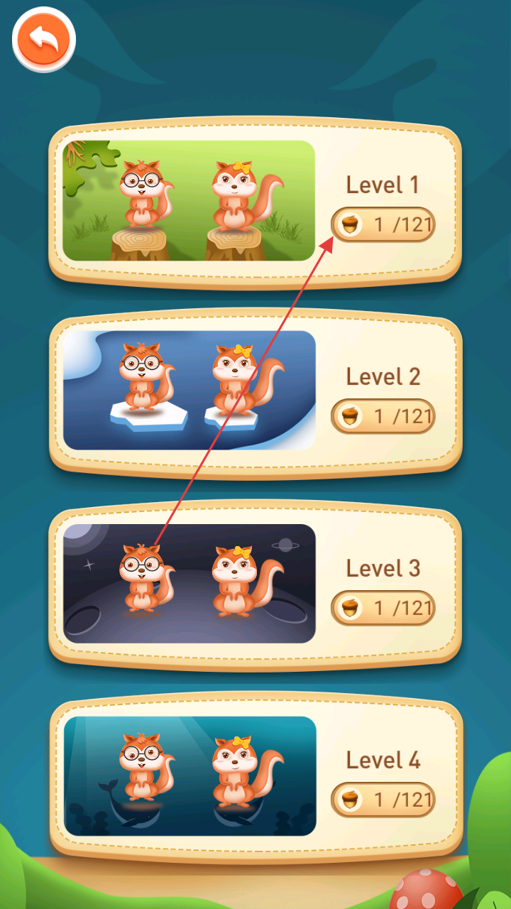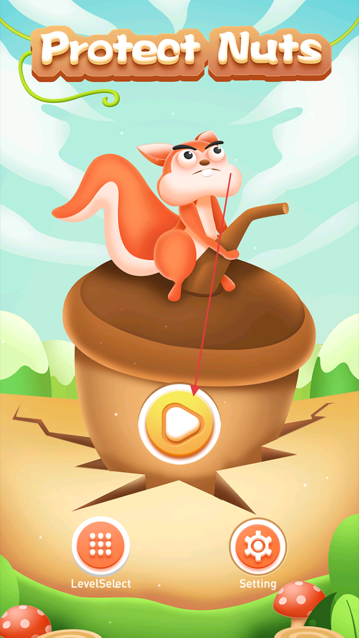 2、在关卡选择界面,点击“Level1”等关卡,进入对应场景,保护松鼠的坚果。