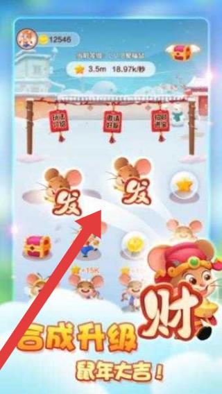 1、在主界面,点击箭头指向的“发”字金鼠,进行合成升级,提升收益速度,积累金币,迎接鼠年主题玩法。