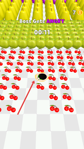 2、吞噬水果:操控黑洞移动,吞食樱桃、苹果等,积累金币与分数。