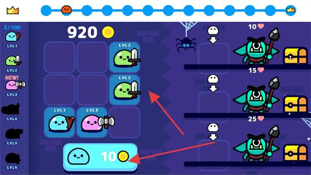 2、物理碰撞合成:通过指尖拖动史莱姆碰撞合成,精准控制碰撞角度与元素比例,提升稀有形态产出概率。