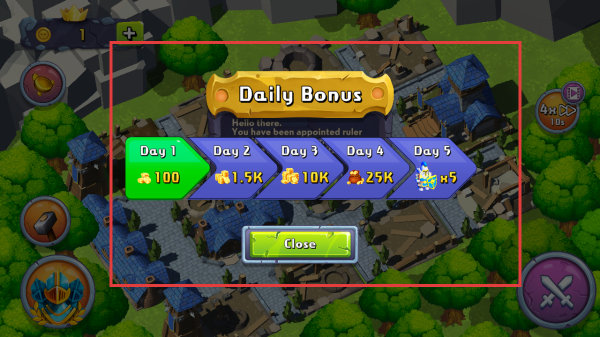 1、登录先领【Daily Bonus】,Day1得100金币,连续签到奖励更丰厚,积累资源,助力王国发展。