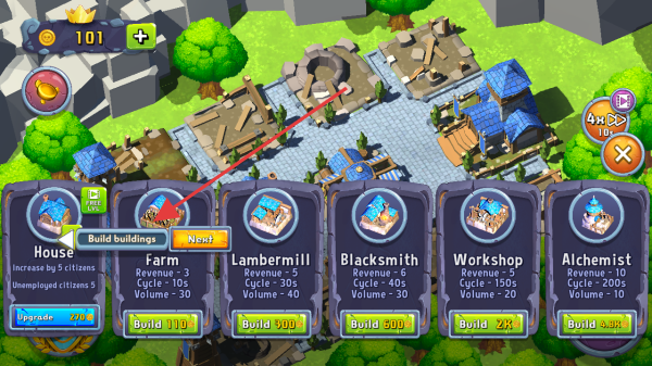 2、在建筑界面,点【Farm】建造,消耗金币,提升粮食产出,满足市民需求,推动城镇发展。