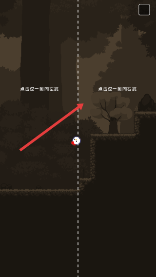 2、游戏中,按提示点击右侧屏幕,让小鸡向右跳跃,跨越障碍,探索森林,遵循“点击这一侧向右跳”规则。