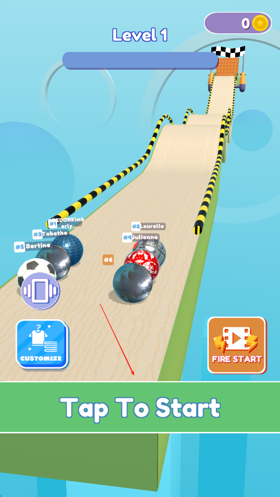 1、进入游戏后选择参赛小球,滑动屏幕适应操控手感,在起点线等待倒计时结束,快速点击屏幕让小球冲出起跑线抢占先机。