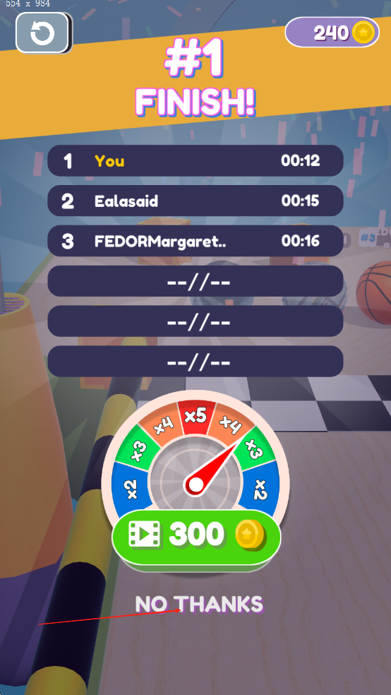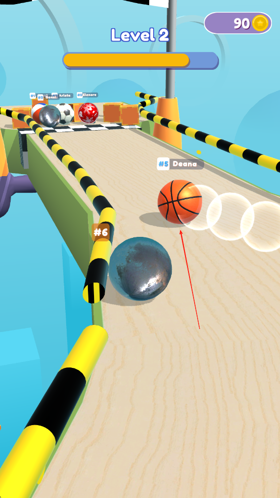 3、抵达终点前的冲刺阶段,长按屏幕触发小球的加速特效,冲破终点线后根据排名获得金币奖励,解锁「闪电球」等特殊皮肤。