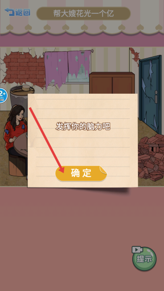 2、确认提示:点击关卡内“确定”按钮,关闭“发挥你的脑力吧”提示弹窗。
