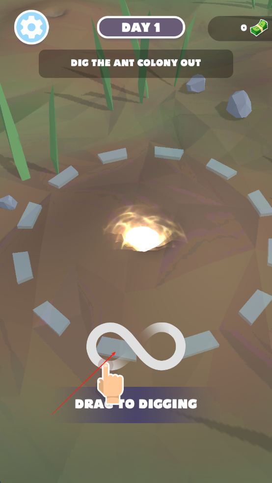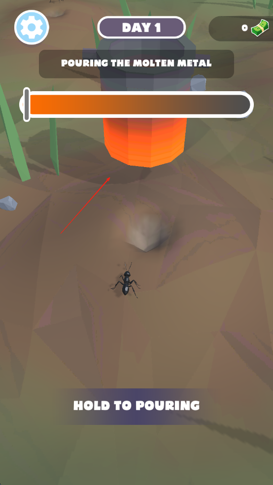 1、进入游戏后在场景界面选择沙漠、森林等不同环境的蚁丘,点击“熔融金属”按钮选择铜、铁等金属材质,对准蚁丘入口倾倒。