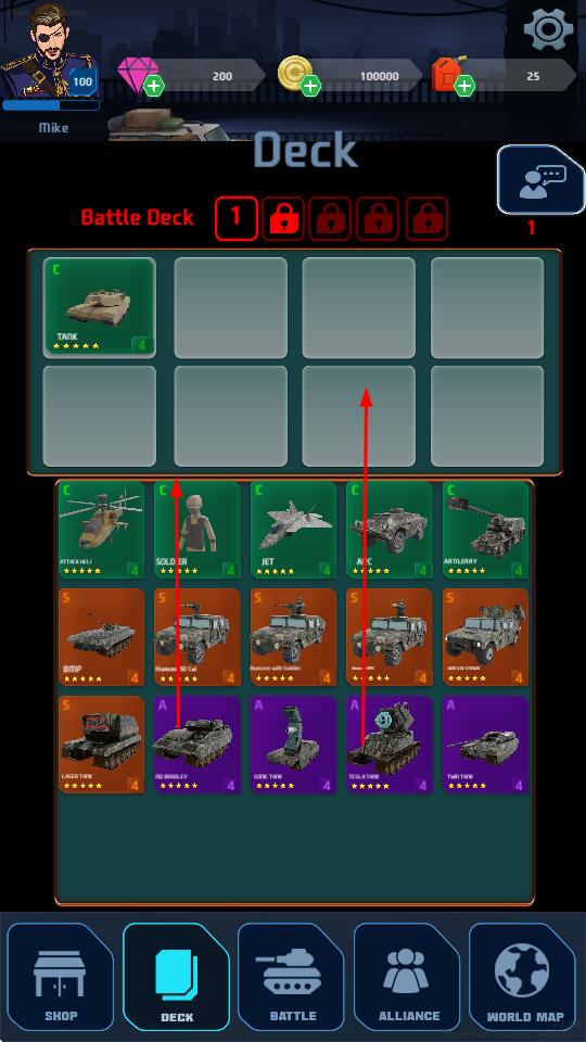1、进入“Deck”界面,从军事单位(坦克、直升机等)中选卡,配置到战斗卡组,强化战力。