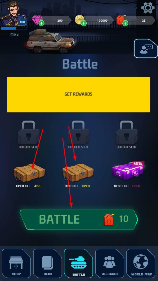 2、在“Battle”界面,消耗燃油(10单位)开启战斗,完成可领箱子奖励,解锁新单位/资源。