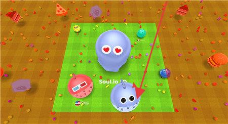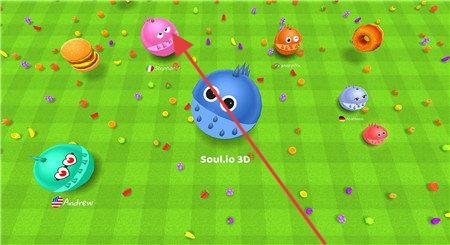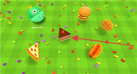 3、指引角色移动,箭头指向蛋糕等食物,吞噬获取成长资源,壮大自身,争夺场景主导权。