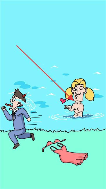 1、第一关,观察人物、场景元素(泳衣、爱心),点击互动,找出让男子摆脱女子的方法。