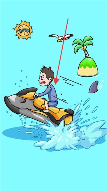 3、第三关,操控男子骑摩托艇,留意鲨鱼、岛屿,点击互动,避开危险,完成水上挑战。