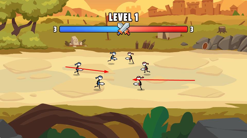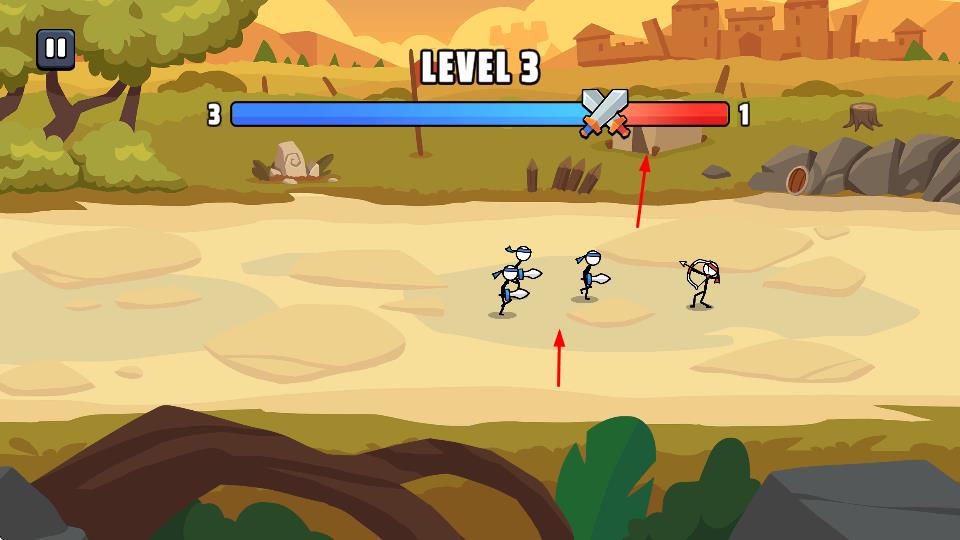 1、在LEVEL1,指挥蓝色火柴人部队,按箭头方向进攻红色敌方,利用数量优势推进战斗。