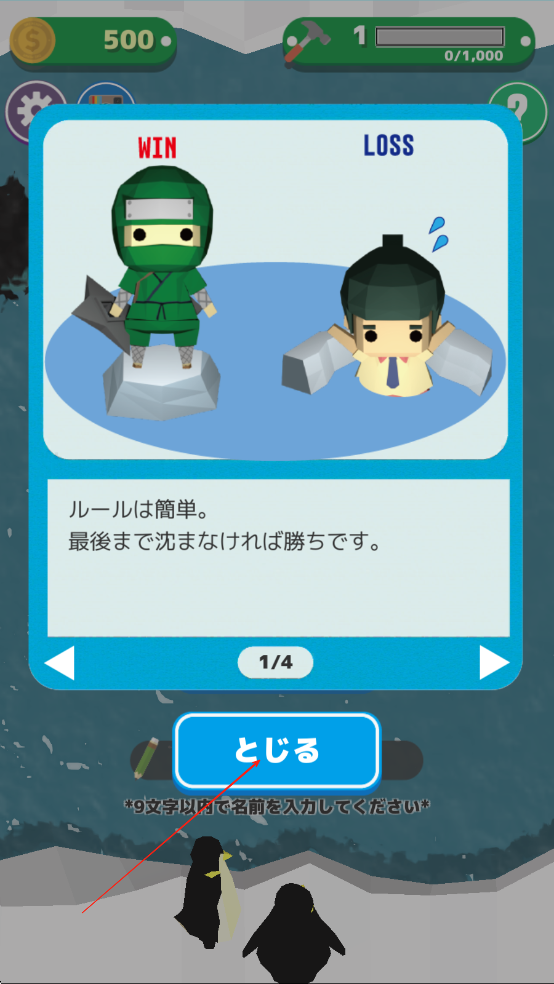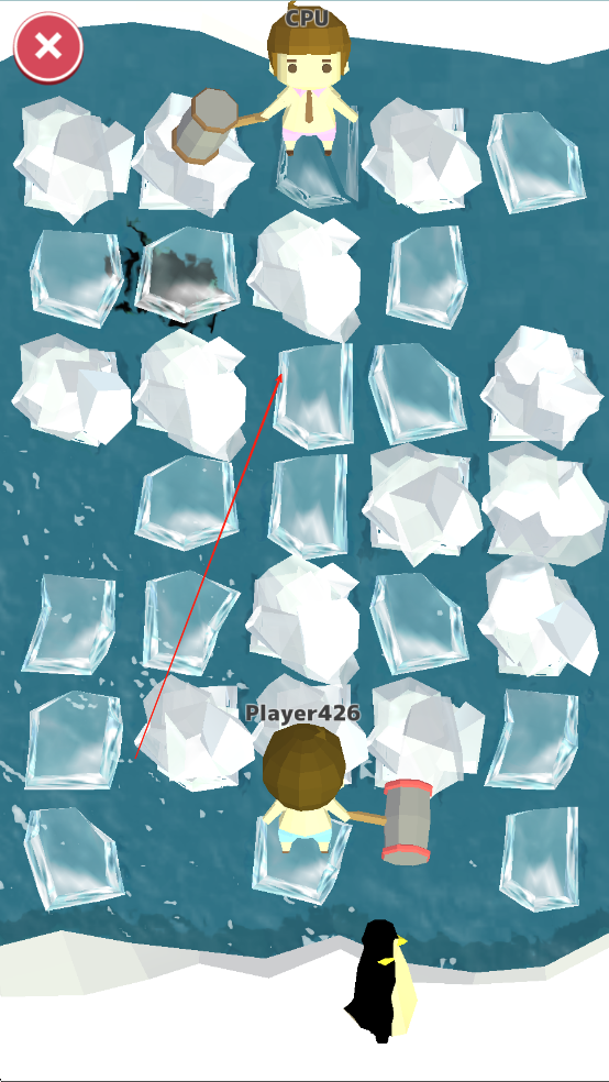 2、对战时点击屏幕敲击脚下冰块,每次敲击会在冰块上留下裂痕,连续敲击同一位置可加速冰块碎裂,同时要躲避对手敲击导致的冰块坍塌。