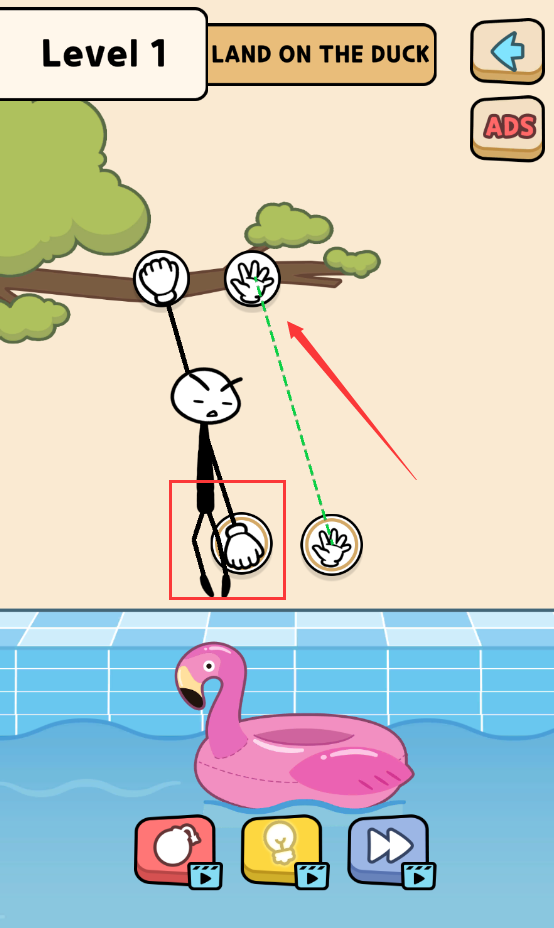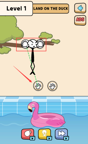 3、将手套往下面对齐后,即可掉落鸭子里即可过关。