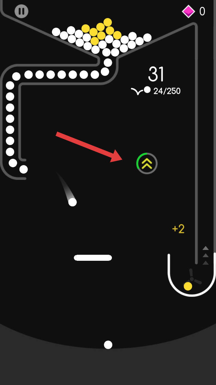 3、持续操控,让小球撞击同色球(如黄色球堆积区域),获取加分同时留意绿色升级图标,提升小球能力。