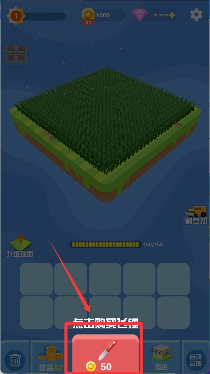 4、完成目标后进入商店,用金币升级武器威力、割草机速度及稻草单价,还可运用钻石购买稀有皮肤,让下一轮割草更有效率。