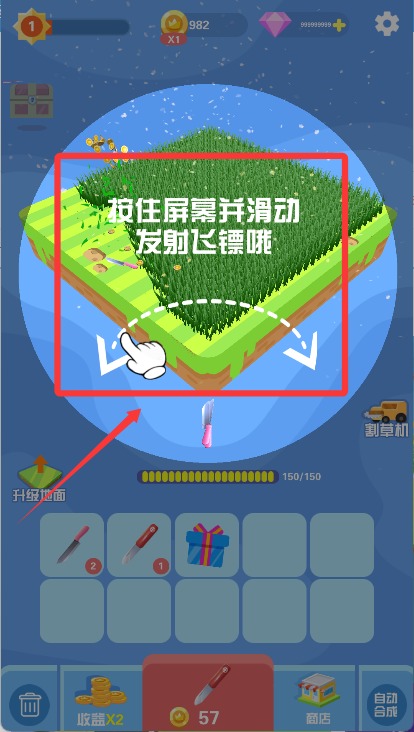 3、按住屏幕并滑动就可以发射飞镖割草了。