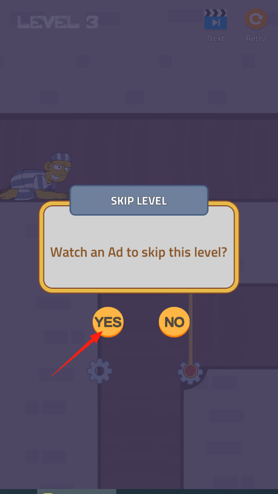 3、若遇难题,可选择“YES”观看广告,跳过当前关卡,继续后续挑战。
