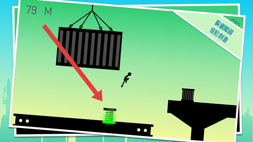 3、看到弹簧道具(绿色发光),引导火柴人跳跃触发,借助弹力越过深坑等障碍,挑战更远距离。